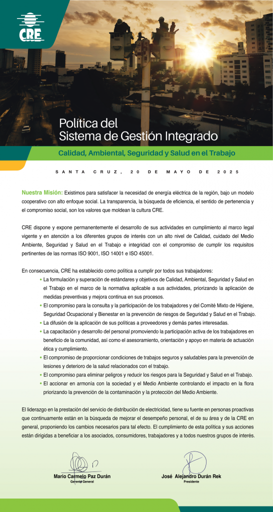 Inicio Acerca de CRE Sistemas de Gestión en CRE implementados Políticas SGI